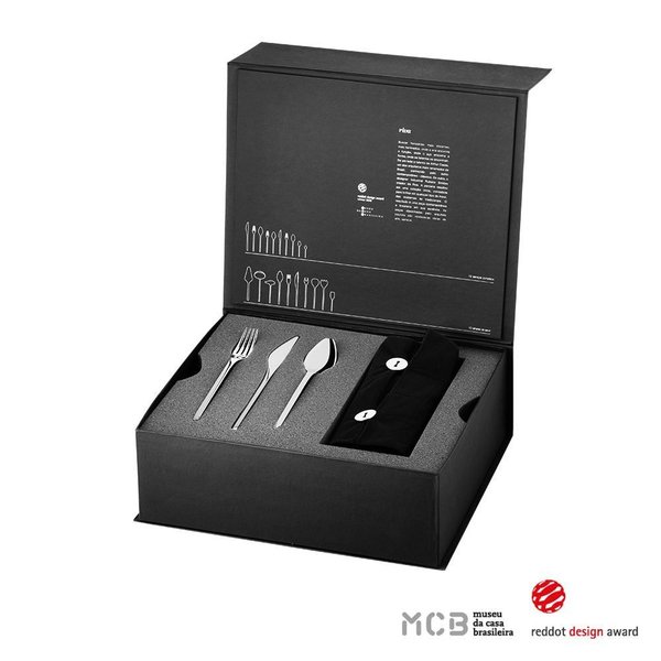 Ousar na forma e no material, somar talentos. Assim surgiu os objetos assinados por Arthur Casas, um dos arquitetos mais renomados do Brasil. A atemporal coleção é inspirada na geometria da cobra Jararaca. O resultado é um traço contemporâneo e brasileiro. O faqueiro completo é composto por 130 itens, que incluem dez peças de servir e dez acessórios individuais para 12 pessoas, o faqueiro está disponível nas versões em aço inox 18/10, prata e ouro 24K. As formas ligeiramente triangulares dos garfos, facas e colheres são inovadoras. A coleção recebeu novos complementos e acessórios de formatos simples e traços surpreendentes, que agregam charme e estilo às atividades diárias. As peças têm em comum o traço atual do prestigiado arquiteto e a alta qualidade e tecnologia da fabricação Riva.