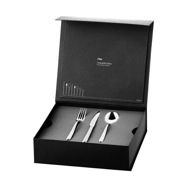 O faqueiro Riva 48 peças possui: 6 facas de mesa, 6 garfos de mesa, 6 colheres de mesa, 6 facas de sobremesa, 6 garfos de sobremesa, 6 colheres de sobremesa, 6 colheres de chá, 6 colheres de café.