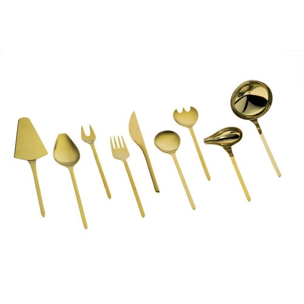O jogo Arthur Casas para servir 9 peças possui: pá para bolo, concha de sopa, concha de molho, colher de servir, garfo de servir, faca trinchante, garfo trinchante, colher de salada, garfo de salada.