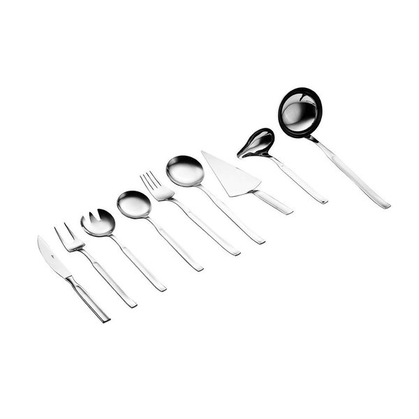 O jogo Manuela 9 peças possui: 1 pá de bolo, 1 concha de sopa, 1 concha de molho, 1 colher de servir, 1 garfo de servir, 1 faca trinchante, 1 garfo trinchante, 1 colher de salada, 1 garfo de salada.